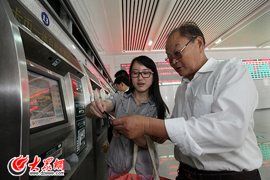 大众网记者帮助来自新疆的朱广华利用自助购票机购票 杨春卫 摄