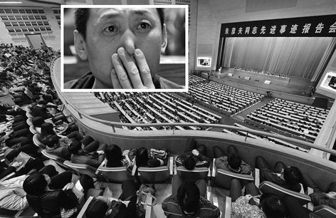 主席台两侧的电子屏幕上,朱彦夫的残臂挥舞着,带着沂源乡音的语调回响着。从这个报告会前放映的短片中,在场观众得知:朱彦夫左眼失明、没手没脚,已经81岁了。多年前的一次中风,让他连穿假肢行走都不能了。