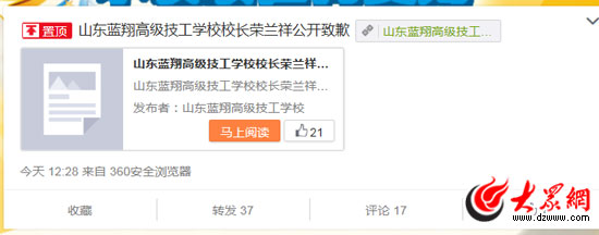 山东蓝翔高级技工学校官方微博将荣兰祥致歉声明置顶