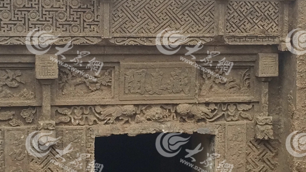 8月24日,大众网记者再次来到现场时,神秘古墓面貌已经完全呈现出来。古墓“正堂”高约三米,按地面上工作人员设定的标示,目测“正堂”内间面积约为6m*4m,全部用石块砌成,顶部檐处覆盖青瓦,石块上刻有精美花纹及文字。古墓分两间,里面通连,面对建筑,左侧一间刻有“驻霞庵(巷)”字样,右侧为“藏真阁”,两间门口分别刻有一副对联,因上面附有泥土,无法清晰辨认所写何字。整个建筑设计接近传统四合院,东西两面建筑用青砖砌成,类似于老建筑中的“影背墙”,“影背墙”边上另有一“洞穴”式建筑,用途及名称不知晓。