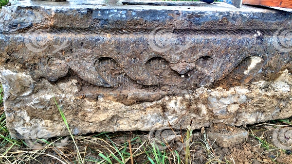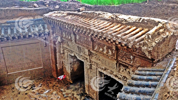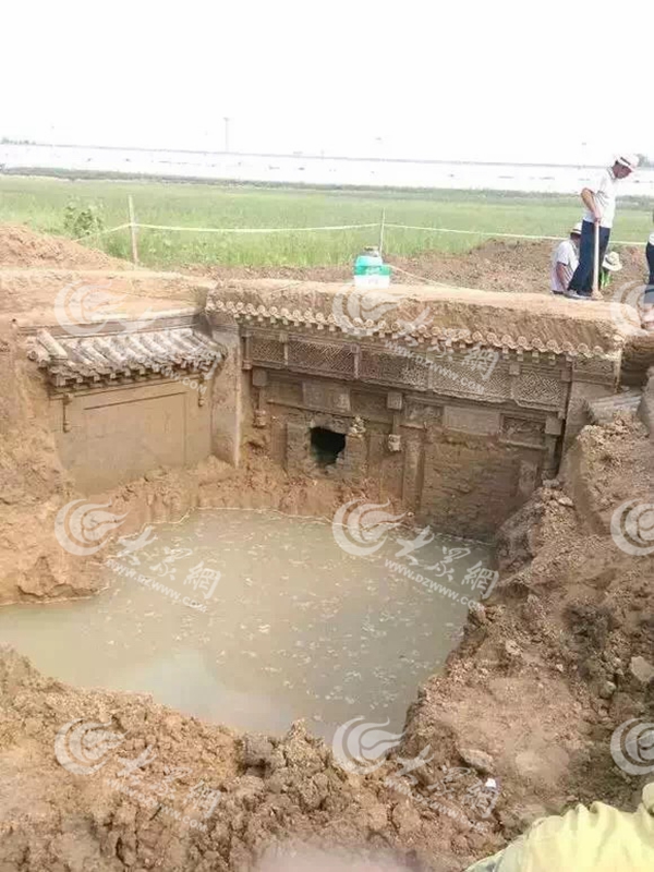 8月22日,神秘古墓顶部已经基本呈现在工作人员面前,结构为北、东、西三面建筑。据附近村民介绍,按照当地习惯,北侧称为两间“正堂”,东西两侧为“偏堂”,因只露出顶端,当时并不能断定该古墓究竟如何陈设。在挖掘出的部分可以看到,古墓三面檐处布满紧密排列的青瓦,东西两面建筑檐上端压有石板,北侧“正堂”檐下的石板上雕刻有精美花纹。为了不损伤古墓,工作人员正在周边动用人工挖掘,随着挖掘深入,建筑边上不断有水流出。