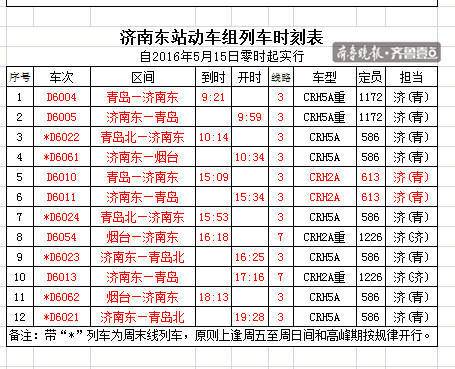 从5月15日起,济南东站将开行6趟图定始发终到动车组列车,这在济南东站历史上属于首次。具体为:青岛~济南 D6004/D6005次改为济南东终到始发;青岛~济南 D6010/D6011次改为济南东终到始发;荣成-济南D6054次改 为济南东终到;济南-青岛D6013次改为济南东始发。