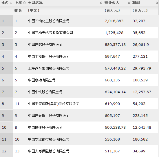 尽管在2015年因油价暴跌导致营业收入大幅下降,但“两桶油”在今年的榜单上仍然稳居前两位,其中中石化营业收入2.02万亿元,中石油1.73万亿元,分别比2014年下降28.6%和24.4%。中国建筑和工商银行继续位列第三和第四。中国移动排名连续第二年下滑一位,今年跌至第六,被上汽集团超越。新上榜的公司包括乐视、携程等互联网企业。