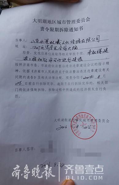 工作人员说,“按照规定,室外广告的悬挂以及西侧他们扩建的那一块,都得提前向我们提出申请,但他们并没走审批程序,所以我们有权将其拆除。”同时,大明湖街道办城市管理委员会还向管理金家大院的文化公司下发了一份责令限期拆除通知书。