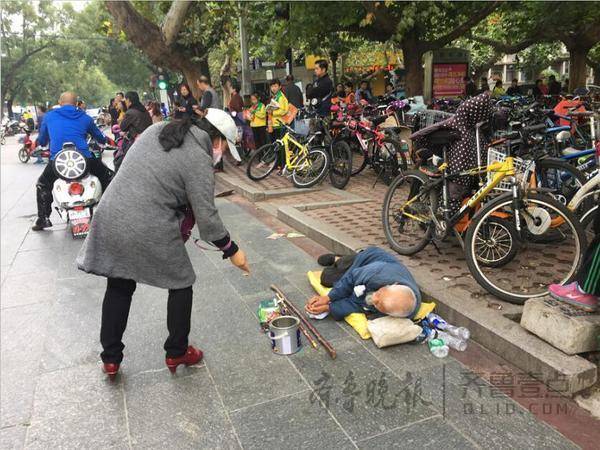 泰安一中北临,一名乞丐躺在地上,来往市民不时地给他施舍一些零钱。