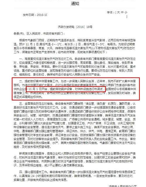 据悉,济南“看天供暖”制度已经实施了8年,2009年、2010年实现了“看天供暖”。2015年供暖季也提前了三天,当年11月12日便开始正式供暖。