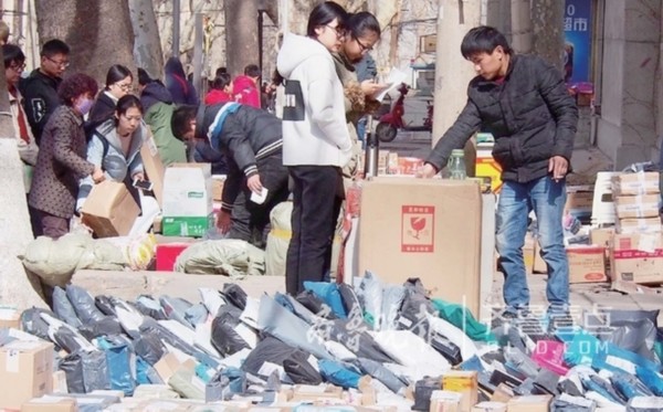 2月20日中午,山师校园内快递工作人员冒着寒风分发大量快件。齐鲁晚报·齐鲁壹点记者周青先摄