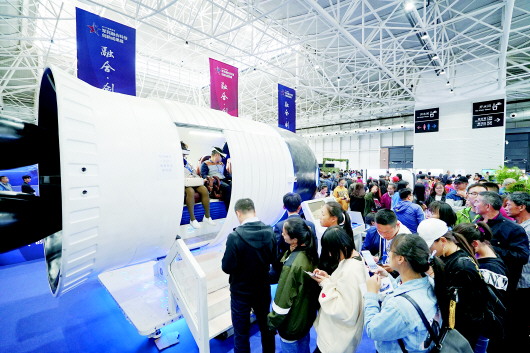 10月10日,首届青岛军民融合科技创新成果展在青岛西海岸新区开幕,图为参展市民体验飞行舱。作为山东省首个军民融合领域的大型展会,本届展会吸引了包括国务院国资委所属的11家央企军工集团以及8所军工科技院校等近400家单位参展,展览面积达到4万平方米。展会共设置西海岸新区军民融合成果展、军工企业成果展、综合科技成果展三大室内展区和一个室外展区,系统展示军民融合深度发展的阶段性成果,重点展示船舶海工、航空航天、电子信息、轨道交通、新能源、新材料等领域前瞻性、颠覆性、创新性技术与成果。