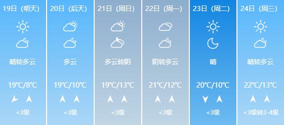 明天夜间到20日多云,南风2~3级,最低气温济阳、商河、章丘、南山区5℃左右,市区及其它区县8℃左右,最高气温19℃。
