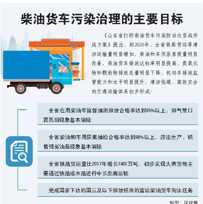本报济南讯 近日,我省印发《山东省打好柴油货车污染防治攻坚战作战方案》(以下简称《方案》),明确到2020年,全省在用柴油车监督抽测排放合格率达到95%以上,排气管口冒黑烟现象基本消除;全省柴油和车用尿素抽检合格率达到98%以上,违法生产、销售假劣油品现象基本消除;全省铁路货运量比2017年增长7401万吨,初步实现大宗货物主要通过铁路或水路进行中长距离运输;完成国家下达的国三及以下排放标准的营运柴油货车淘汰任务。