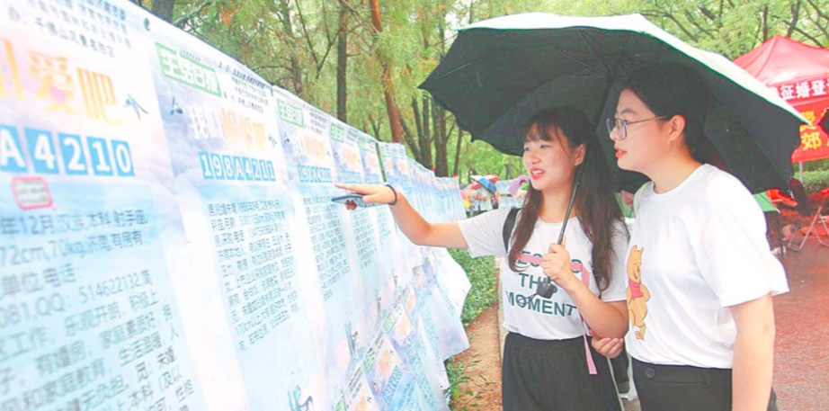 8月6日,两名来相亲会的女孩在认真研究展示牌上的信息。