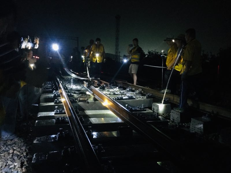 接到封锁命令后,施工人员从安全围栏外迅速进入施工现场,争分夺秒地进行松扣件、锯轨、推送钢轨等工作。现场机器轰鸣声此起彼伏,清理线路、钢轨合拢、填充道碴、捣固作业等各道工序有条不紊向前推进。