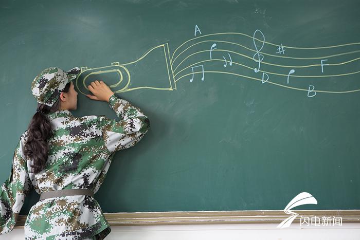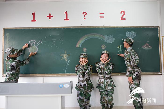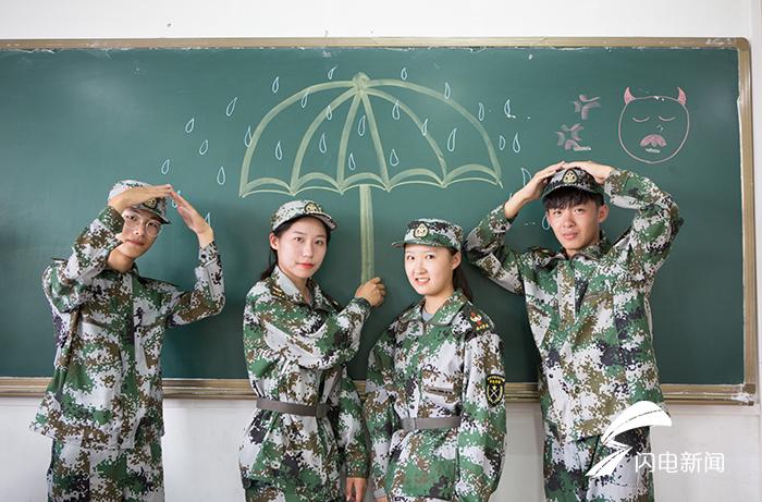 当日,数学科学学院5名新生在军训休息时间,在教室和操场上,通过黑板绘画、错位拍摄等形式,拍摄一组创意军训照片,这种形式可以给炎热的军训带来一丝清凉,既留下珍贵回忆,又可以巩固新同学之间的友谊,非常有趣。