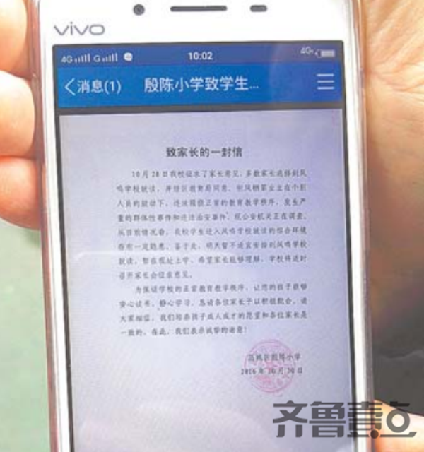 “QQ群里有一位老师发了带有学校公章的《致家长的一封信》,上面说明天暂不适宜安排到凤鸣学校就读,暂在现址上学,希望家长能够理解,学校将适时召开家长会征求意见。”得知这个消息后,陈先生说他感觉自己再次被欺骗了,而更让他感到心痛的是,孩子们先后被鲍山学校和凤鸣学校拒绝在门外,像皮球一样被踢来踢去。