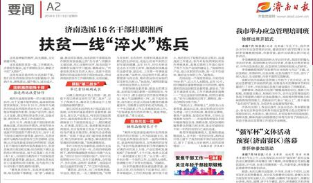 去年10月,两地互派干部挂职机制落地实施。在扶贫协作期内,济南市将分4批次选派干部到湘西州挂职锻炼,每批选派不同层级的干部9名左右,其中1名干部挂任湘西州委常委、副州长,负责济南市与湘西州扶贫协作工作总联络、总协调;从市发改委或其他经济管理部门选派1名干部挂任湘西州发改委副主任,负责具体项目规划和实施;结合两地下辖区县的结对帮扶情况,每个区选派1名干部(共7名),分别挂任湘西州7个国家级贫困县的县委常委、副县长,具体负责本区对口支援帮扶项目落地。迄今我市已有16名年轻干部在湘西州挂职。