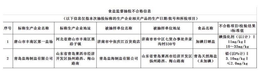 本次抽检中,唐山市丰南区第一盐场、青岛盐海制盐有限公司两家企业生产的加碘日晒盐、青岛天然海盐(未加碘)2批次产品不合格,不合格项目为碘含量、铅。