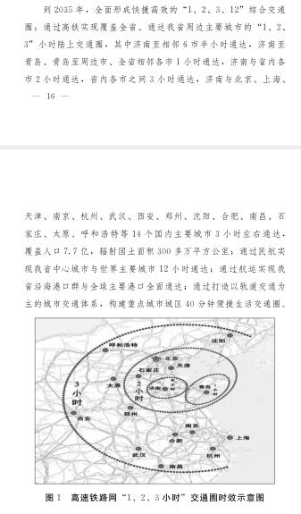 “1、2、3、12”综合交通圈,即通过高铁实现覆盖全省、通达我省周边主要城市的“1、2、3”小时陆上交通圈,其中济南至相邻6市半小时通达,济南至青岛、青岛至周边市、全省相邻各市1小时通达,济南与省内各市2小时通达,省内各市之间3小时通达,济南与北京、上海、天津、南京、杭州、武汉、西安、郑州、沈阳、合肥、南昌、石家庄、太原、呼和浩特等14个国内主要城市3小时左右通达,覆盖人口7.7亿,辐射国土面积300多万平方公里;通过民航实现我省中心城市与世界主要城市12小时通达;通过航运实现我省沿海港口群与全球主要港口全面通达;通过打造以轨道交通为主的城市交通体系,构建重点城市城区40分钟便捷生活交通圈。