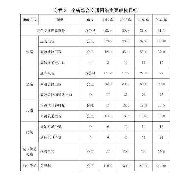 《规划》提出,紧紧立足山东发展实际,尽快补齐交通短板,全力推动航空优先发展,积极推进高速铁路、高速公路接续发展,实现各种交通方式统筹一体布局。高速铁路通车里程现为1240公里,到2035年,全省路网总规模达到5700公里,同步规划800公里市域铁路,高铁网络覆盖县域范围达到93%以上,高铁通道进出口增加到15个,时速350公里高铁占比提高到80%以上,全面构建“四横六纵”现代化高铁网络,形成覆盖全省的 “省会环、半岛环、省际环”格局。高速公路通车里程现为5820公里,到2035年,全省路网总规模达到9000公里,覆盖全省所有县 (市、区),高速公路通道进出口增加到27个,与普通干线公路和城市主干道路高效衔接,形成 “九纵五横一环七射多连”网络布局,力争实现通道内均有2条以上贯通的高速公路。沿海港口加快港口资源整合步伐,尽快形成以青岛港为龙头的现代化沿海港口群。构建以京杭运河、小清河、黄河、徒骇河航道 “一纵三横”为主骨架,以济宁港为核心,枣庄、菏泽、泰安港为辅助,其他一般港口为补充的航运体系,把内河航运发展成带动沿河产业带兴起的 “黄金水道”。运输机场实施民航优先战略,提升完善济南、青岛、烟台枢纽机场功能,统筹推进淄博、枣庄、东营、潍坊、济宁、泰安、威海、日照、临沂、德州、聊城、滨州、菏泽支线机场规划建设,构建 “三枢十三支”运输机场格局,形成渤海湾南部运输机场群,推动机场群与城市群协同发展。统筹城市内外交通协调发展,提升城市大型综合客运枢纽通联能力,形成高速铁路、高速公路、城市轨道交通和城市快速路、主干路高效一体衔接的网络格局。统筹推进油气管道和储运设施建设,改造提升老旧管道,形成布局合理、安全高效的油