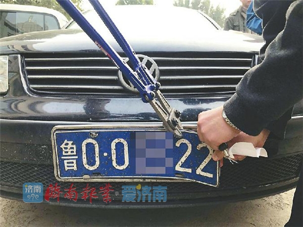 一辆鲁O车现场拆牌 记者谢苗苗 摄