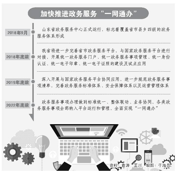 近年来,我省不断加快政务服务平台建设。今年9月,山东省政务服务中心正式运行,标志着覆盖省市县乡四级的政务服务体系形成,群众办事由“一事跑多窗”变为“一窗办多事”,由“跑部门”转变为“跑政府”,实现了“多门”变“一门”。根据部署,2018年年底前,我省将进一步完善省市政务服务平台,与国家政务服务平台进行对接,开展统一政务服务门户、统一政务服务事项管理、统一身份认证、统一电子印章、统一电子证照的建设及试点应用。2019年年底前,深入开展与国家政务服务平台协同应用,进一步规范政务服务事项清单,完善政务服务标准体系、安全保障体系以及运营管理体系。2022年年底前,政务服务事项办理做到标准统一、整体联动、业务协同,各类政务服务事项全部纳入平台运行和管理,全面实现“一网通办”。