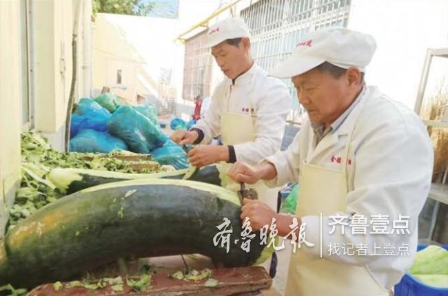 在济南金德利配送餐中心,工作人员正在进行净菜工作。