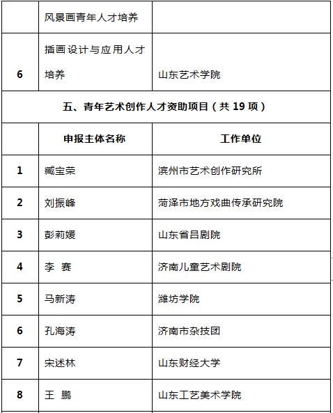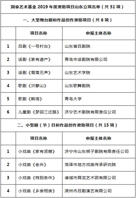 12月29日,记者从省文化和旅游厅艺术处了解到,经国家艺术基金专家严格评审,并报国家艺术基金理事会批准,《国家艺术基金2019年度资助项目立项名单》予以公示,其中山东入选51项,全国排名第六。更可喜的是,一批40岁以下的青年编剧、美术人才顺利入选个人项目,或领衔创作的作品入选资助。名单如下: