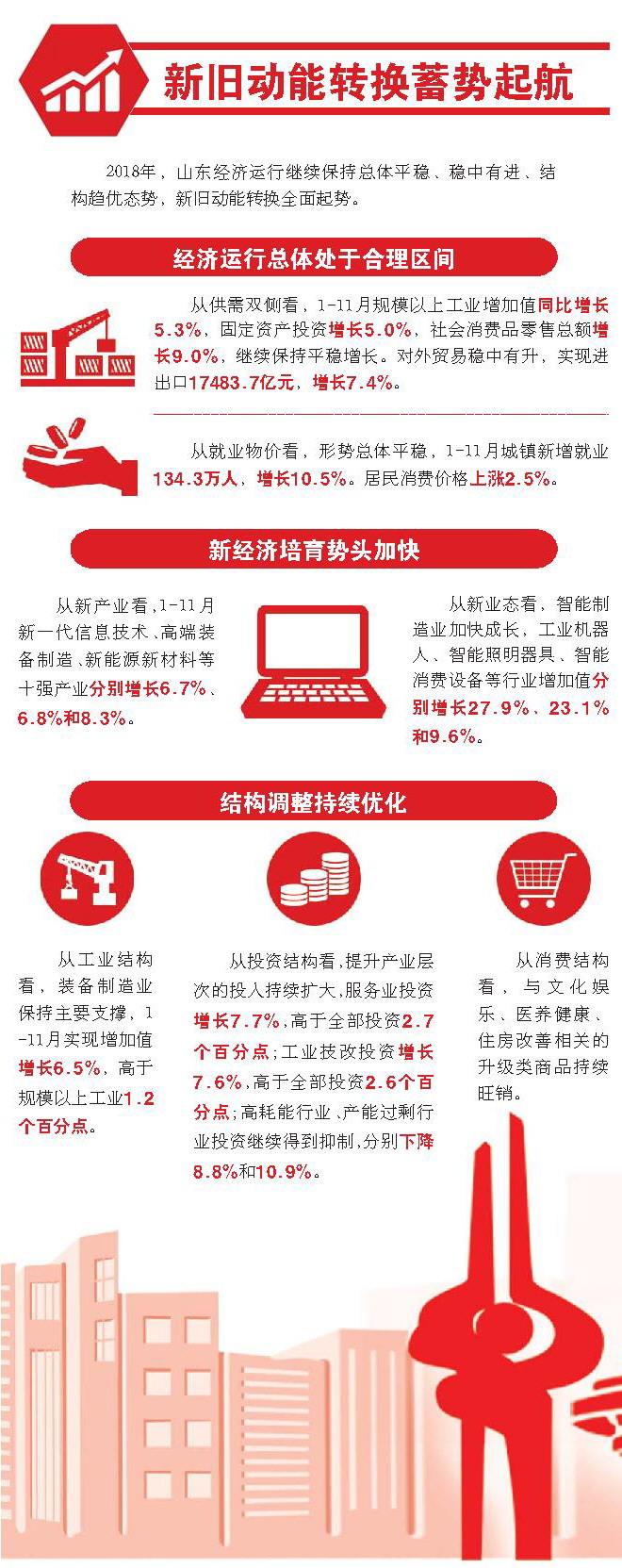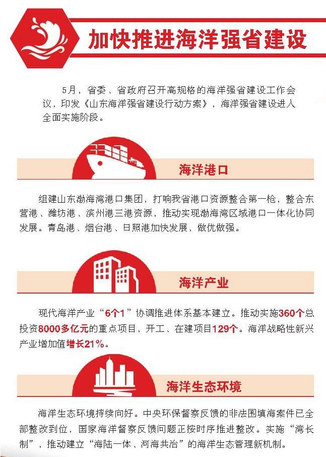 2018年,山东按照习近平总书记“两个走在前列、一个全面开创”的重要指示要求,坚定践行新发展理念,加快新旧动能转换,打造乡村振兴的齐鲁样板,建设海洋强省,打好三大攻坚战,推动军民融合深度发展,打造对外开放新高地,坚定不移推进高质量发展。一年来,山东密集部署一系列改革举措,全省上下士气高昂、干劲充足。