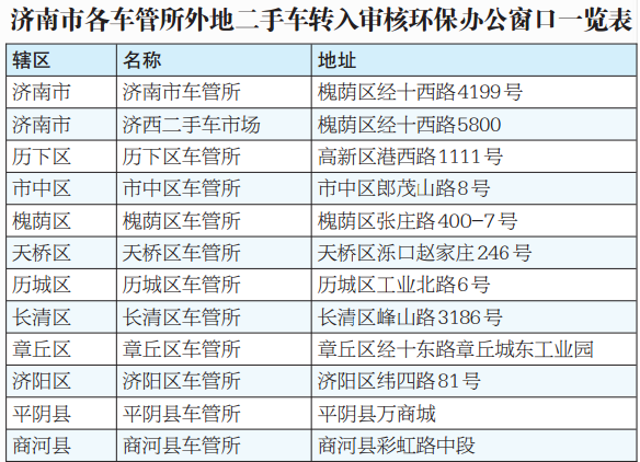 外地转入二手车审核业务由公安机关车辆管理部门与环保部门联合开展,在市车管所及各区县车管所均设有联合办公窗口,车主可就近办理。