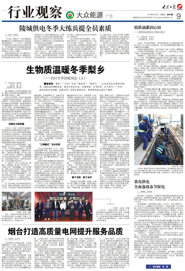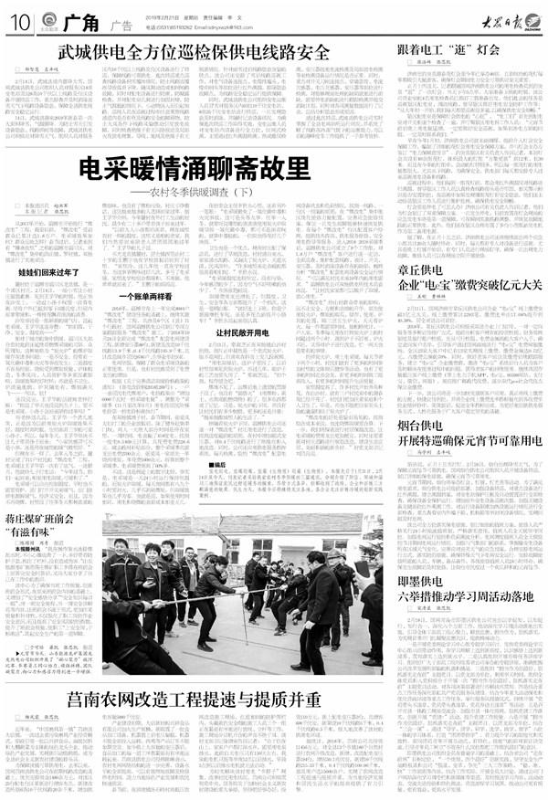 2月21日,大众日报在第九版刊发长篇通讯《电采暖情涌聊斋故里》,这是山东省委机关报新春走基层,赴淄博市淄川区洪山镇、罗村镇和双杨镇对当地农民进行电采暖的调查报道,也是《农村冬季取暖调查》的第三篇。此前的1月31日和2月14日,大众日报先后刊发了《生物质温暖冬季梨乡》以及《兖矿“蓝天”为“煤”》两篇通讯,反映的是记者赴阳信县、邹城(兖矿)实地采访生物质和清洁型煤为农村供暖的探索。