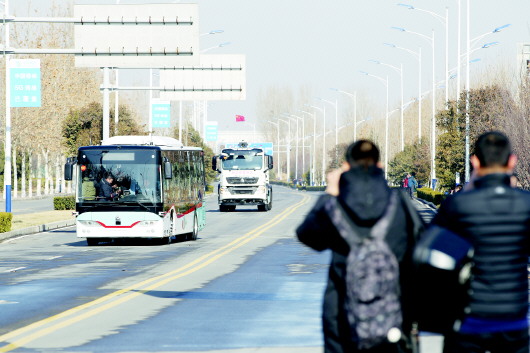 济南市5G通信智能网联汽车测试道路日前启动,全球首台L4级无人驾驶电动卡车和特定区域低速自动驾驶公交车两款智能网联产品亮相。 (□CFP 供图)