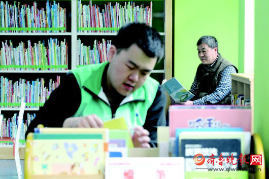 刘长伟正坐在图书馆的角落里看书,如果儿子刘峻实遇到突发情况,他好及时处理。 齐鲁晚报记者 王鑫 摄 (资料片)