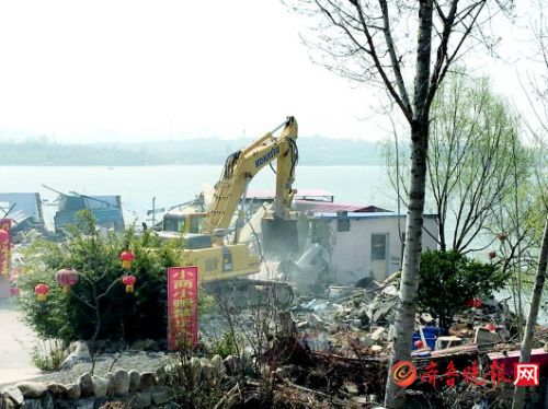 3月26日,雪野湖沿湖一家违法饭店正在被拆除。