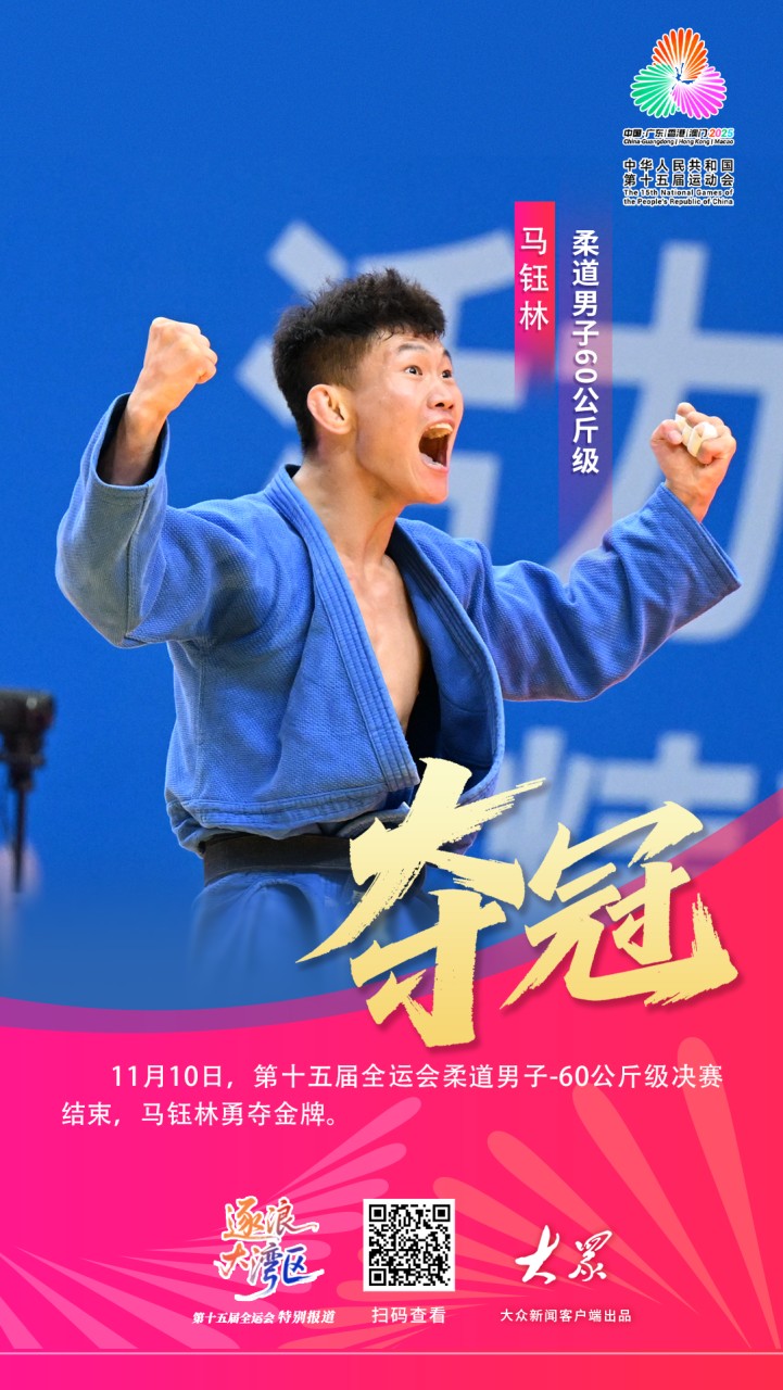 11月10日,第十五届全运会柔道男子-60公斤级决赛结束,山东运动员马钰林勇夺金牌。