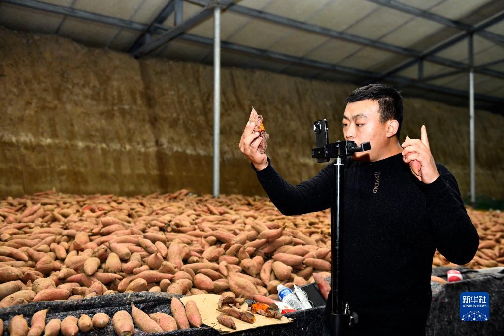 11月10日,在夏津县后赵庄红薯农民专业合作社,主播在卖蜜薯。