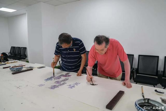 参观之余,众人来到云间画室斟酌考究一番,两位教授联袂作画《紫气》,将各自在国画方面的喜好和所长留于宣纸之上。画作由梁文博教授以淡紫色起手,将一簇紫藤花瓣呈现在画纸的中央。色彩浓度的渐变让人似乎能看出花瓣厚度的不同,蓝紫色变换则将紫藤花的特点一再深化,更让人惊喜的是画笔上同时蘸染两种色彩,一笔下去,花瓣刚诞生就被涂抹了新妆。